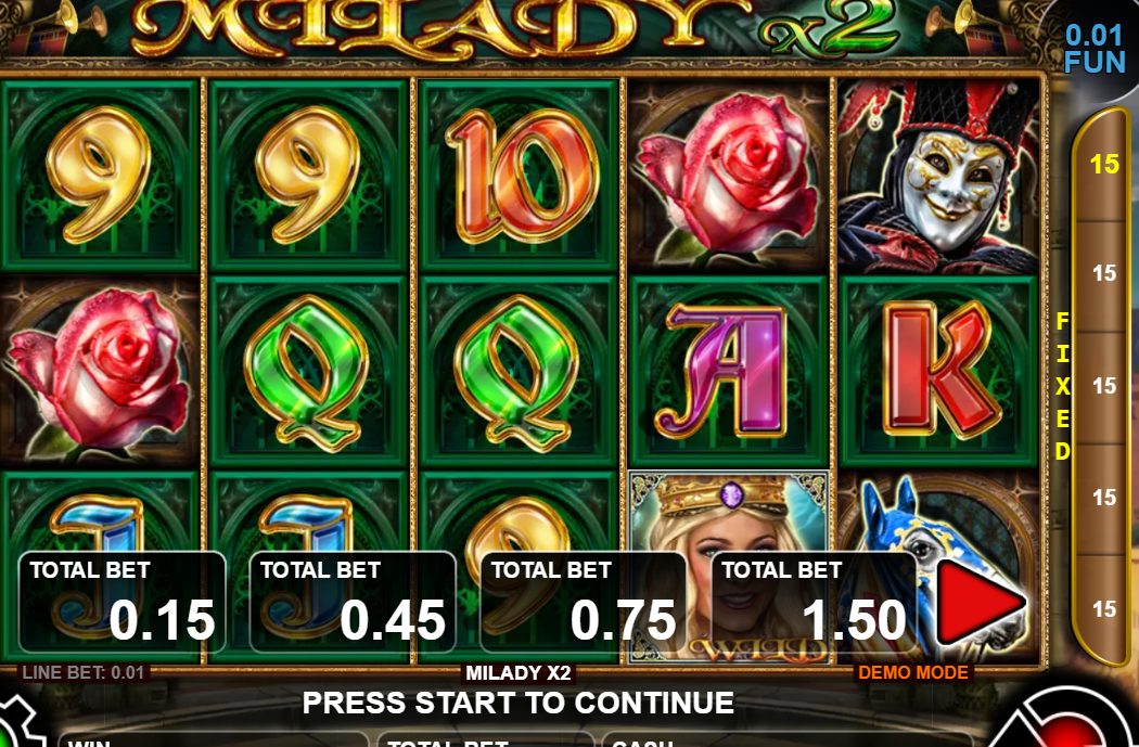 Overview of the game layout and design: Milady x2 features a visually appealing layout with vibrant colors and engaging graphics. The game is set against a backdrop of a medieval castle, adding to the overall immersive experience.
